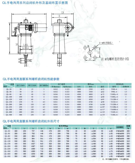 啟閉機(jī)有QP系列平面閘門卷揚(yáng)式啟閉機(jī)、QPK系列卷揚(yáng)式快速閘門啟閉機(jī)、QH系列弧形閘門啟閉機(jī)、QL直聯(lián)式螺桿啟閉機(jī)等四個系列。均分單、雙吊點(diǎn),單 獨(dú)、集中驅(qū)動,和手搖(卷揚(yáng)啟閉機(jī)2X250KN以下有)、電動兩用。各種機(jī)械廣泛應(yīng)用于電、航運(yùn)、城市給排水、泄洪、污水處理、水產(chǎn)養(yǎng)殖及農(nóng)田水利建設(shè) 工程的平面閘門、弧形閘門、快速閘門的啟閉。中型平面輪閘門和中型 弧形閘門。品種,性能可靠。