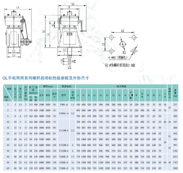手電兩用啟閉機(jī)是一種全方位多功能啟閉機(jī),廣泛用于水利水電工程、河道治理工程、各類給排水工程及城市污水治理工程中的閘門(mén)、堰門(mén)、提拔閥、排泥閥及檢修的升降調(diào)節(jié)。 手電兩用啟閉機(jī)結(jié)構(gòu)由機(jī)殼、機(jī)蓋、支架、螺母、螺桿、壓力軸承、螺桿、蝸桿、蝸輪手搖柄、電機(jī)、電器等組成。手電兩用啟閉機(jī)采用蝸輪,蝸桿變速螺母旋轉(zhuǎn),使螺桿上下運(yùn)動(dòng),安全性能高,手電兩用啟閉機(jī)具有扭矩保護(hù)和行程限位雙重防護(hù)措施;操作方便,可實(shí)現(xiàn)遙控和現(xiàn)場(chǎng)操作,單臺(tái)控制和集中控制等多種控制形式;手電兩用啟閉機(jī)有開(kāi)度指示,精確可靠,有開(kāi)閉燈光信號(hào)指示;可先用普通型、戶外型、防爆型等多種形式,可適應(yīng)各種不同環(huán)境的需要。