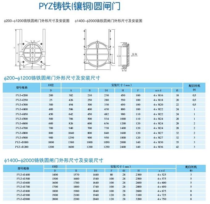 鑄鐵鑲銅圓閘門(mén)與啟閉機(jī)配套使用,閘門(mén)為工作部分,啟閉機(jī)為圓閘門(mén)開(kāi)啟與關(guān)閉的執(zhí)行部分,從而開(kāi)啟或關(guān)閉閘門(mén),達(dá)到 水、關(guān)水或調(diào)節(jié)水位的目的。