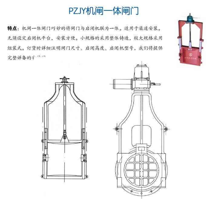 特點(diǎn):機(jī)閘一體閘門巧妙的將閘門與啟閉機(jī)聯(lián)為一體。適用于渠道安裝。無須設(shè)定啟閉機(jī)平臺,安裝方便。小規(guī)格的采用整體鑄造,較大規(guī)格采用組裝式。訂貨時詳細(xì)注明閘門尺寸、啟閉高度、啟閉機(jī)型號,我們將提供完整詳備的安裝圖。