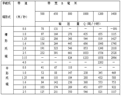 表中輸送量是在物料容量Y=1.0噸∕米3輸送機傾角0°~7°、物料動堆積角為30°的條件下計算出的。